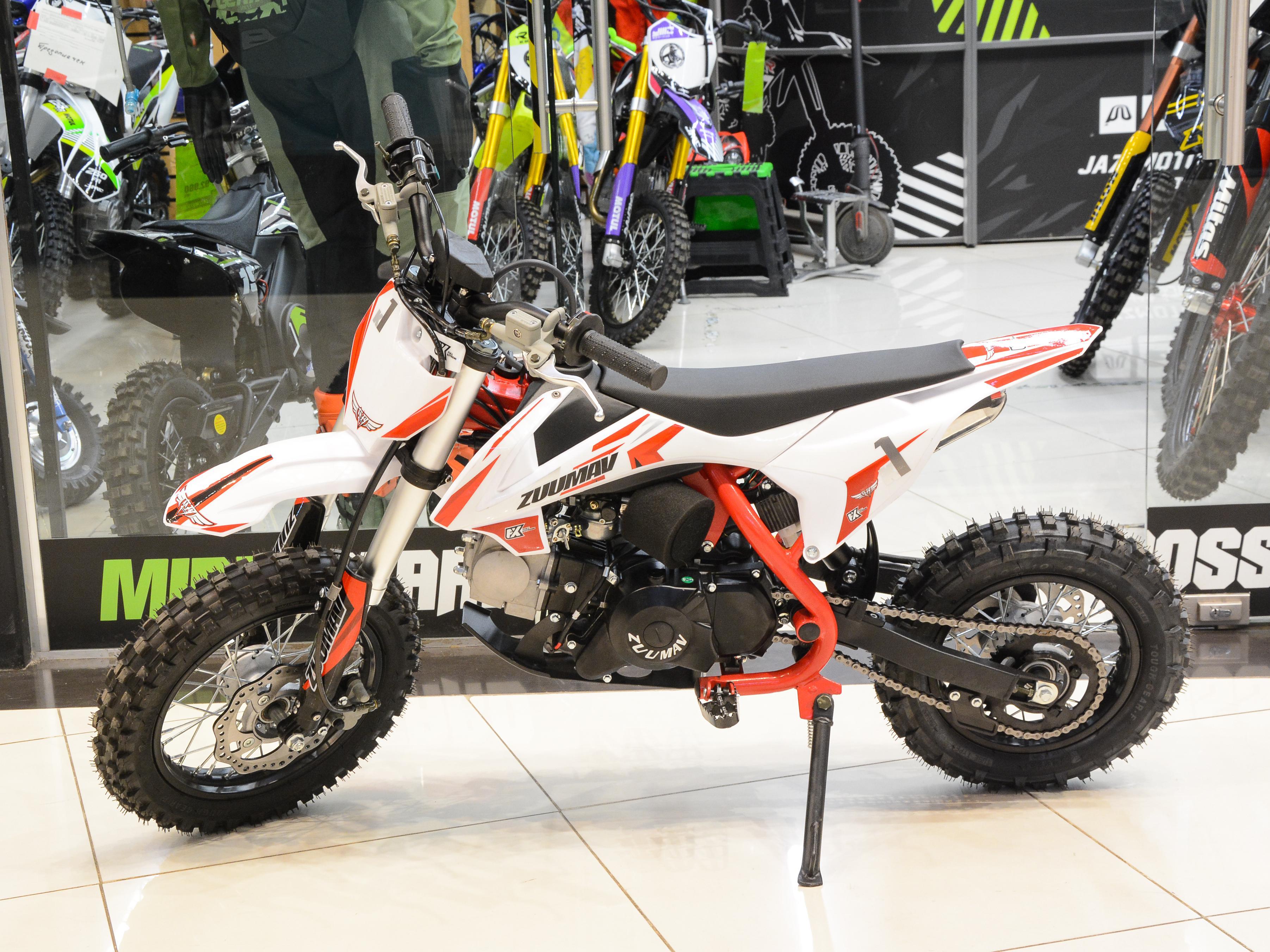 Питбайк Zuumav FX K1.0 90 cc 12/10 для детей от 4 до 12 лет идеально подходит для поездок по грунтовым дорогам и бездорожью в специально отведенном месте. Имеет трубчатую стальную раму, одноцилиндровый четырехтактный двигатель воздушного охлаждения с электростартером и карбюратором Jingke, обеспечивающий выходную мощность около 6 лошадиных сил и объем 90 см3. Питбайк оснащен автоматической коробкой передач и электронной системой зажигания (CDI) для более плавной работы. Передняя подвеска оснащена телескопической нерегулируемой вилкой перевернутого типа, а задняя подвеска оснащена моноамортизатором с большим ходом. Весит детский мотоцикл около 50 кг и имеет грузоподъемность до 60 кг. Он поставляется с R10 задним и передним колесом R12. Высота сиденья составляет 680 мм, что делает катание детей комфортным. Бесплатная доставка доступна по всей территории Российской Федерации, а для дополнительного удобства предусмотрены программы кредита и рассрочки.